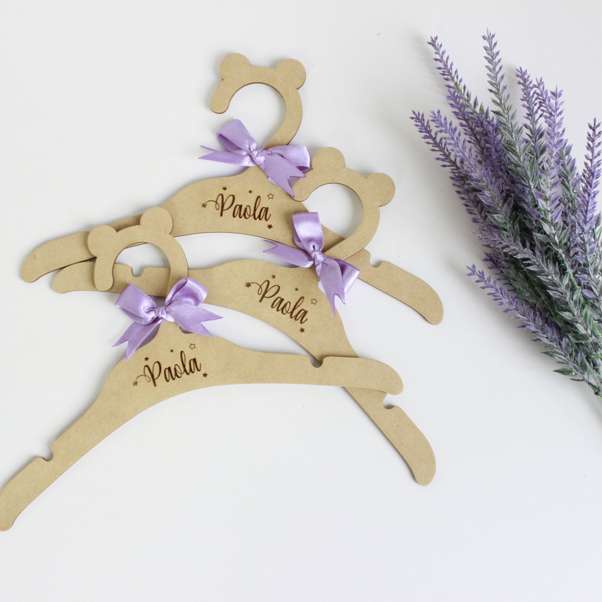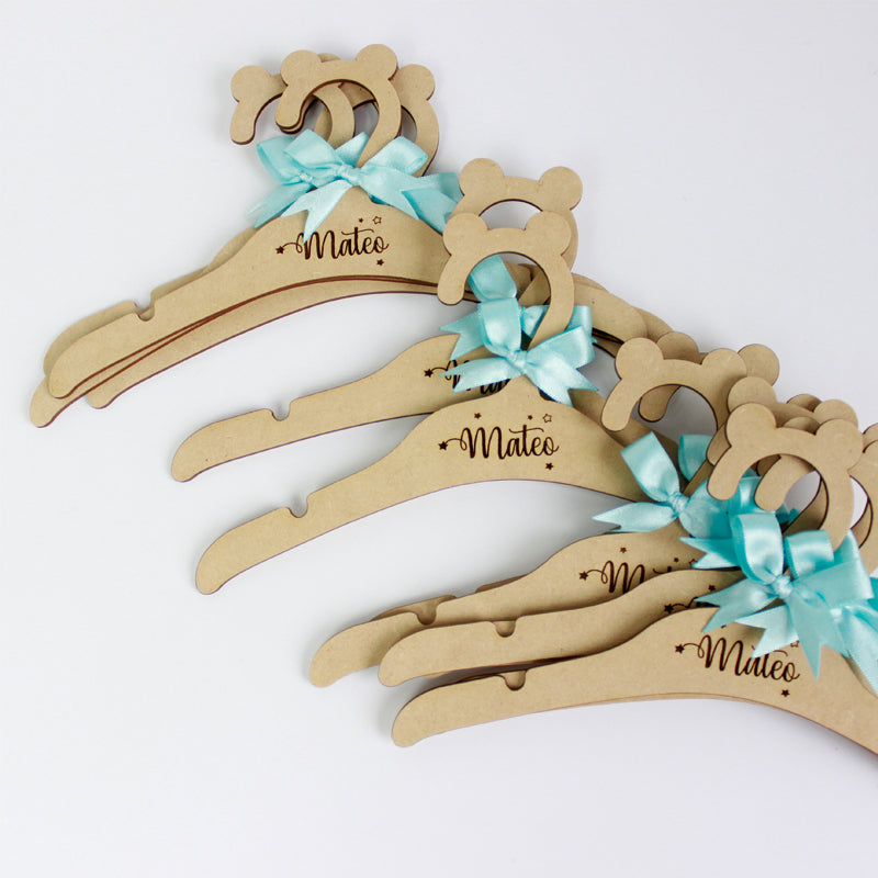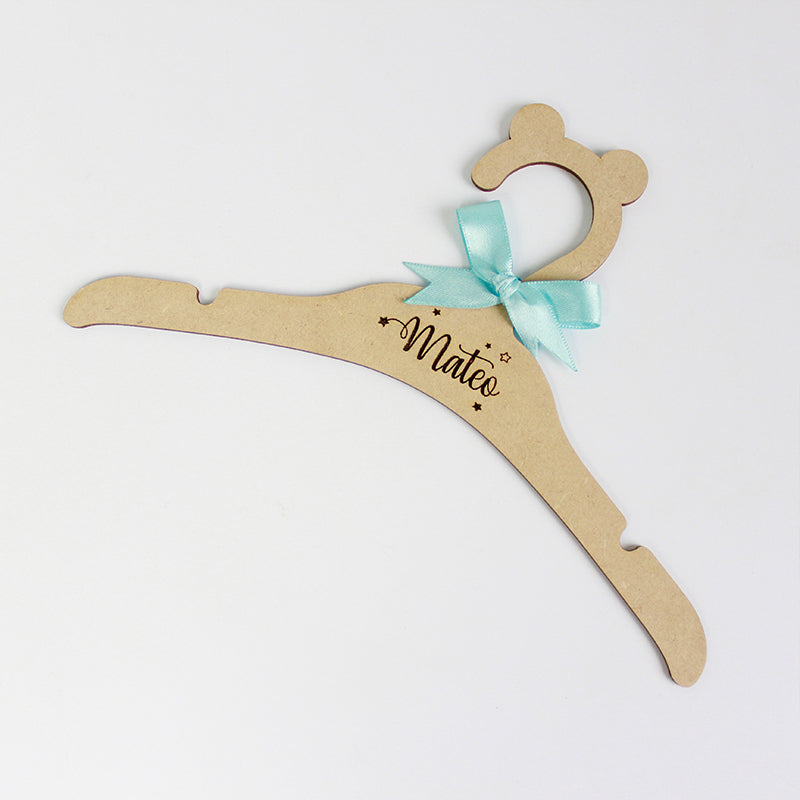 Nuestras perchitas de lujo en madera natural, con el nombre grabado, son el toque perfecto para mantener el clóset de tu bebé organizado y lleno de estilo