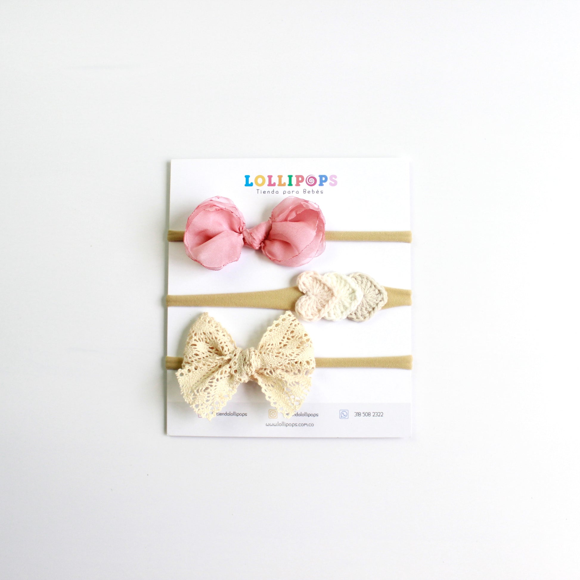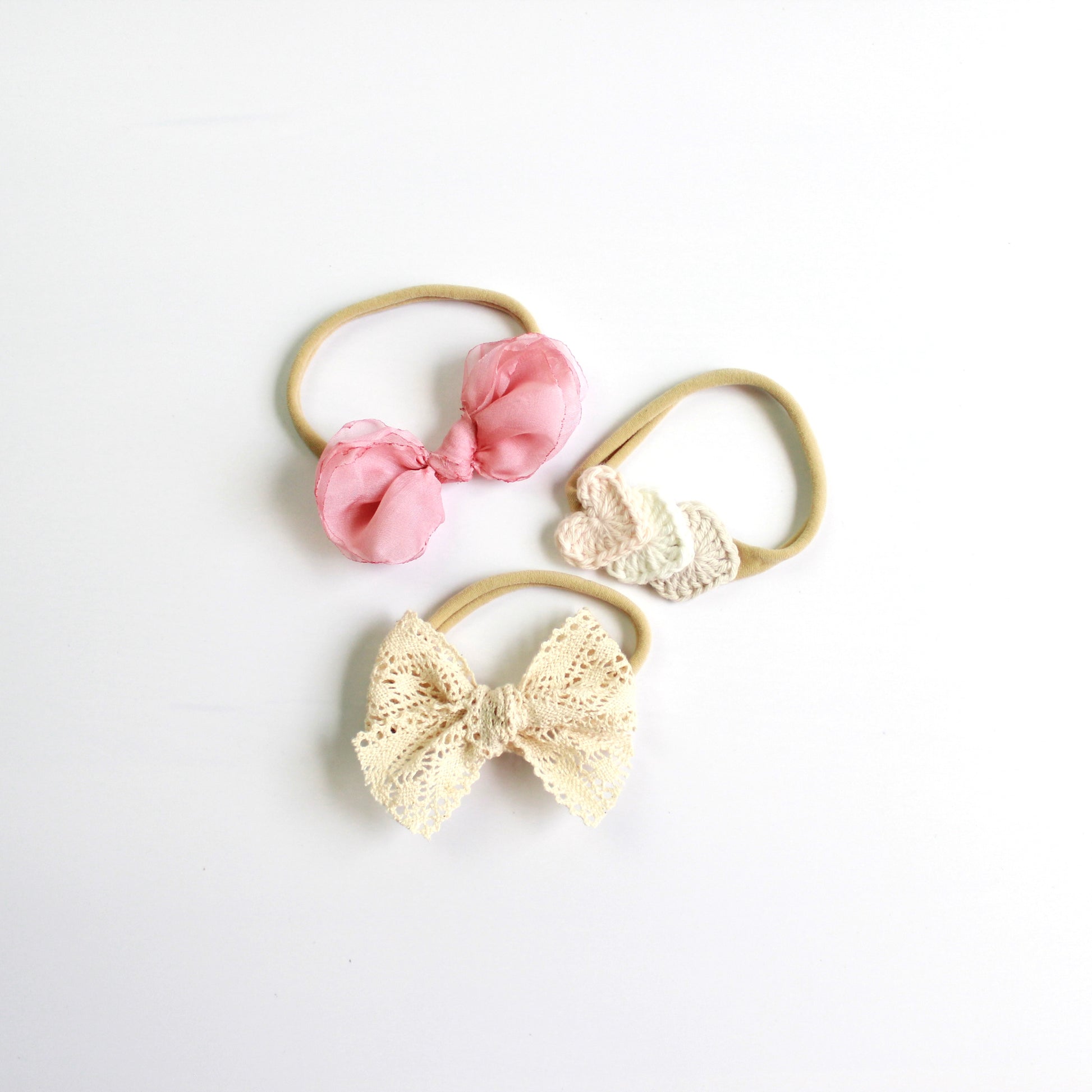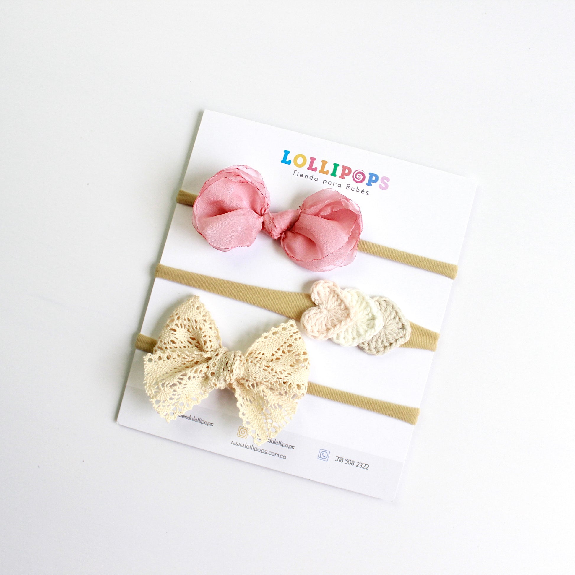 Lazos exclusivos hechos 100% a mano, elaborados en encaje de algodón, velo y tejido, con banda elástica de nylon suave que se adapta perfectamente sin lastimar.